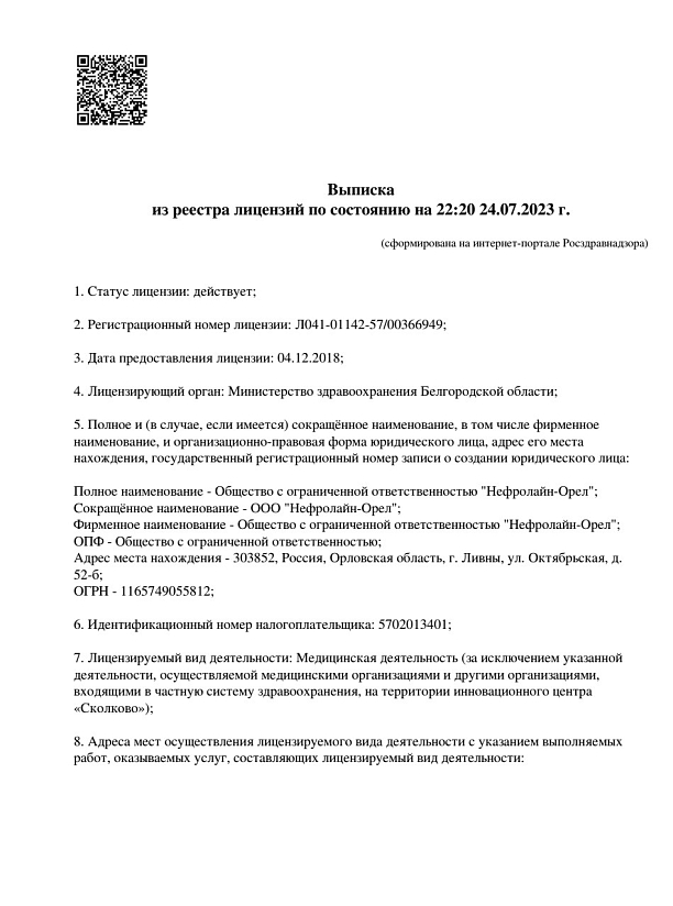 Я, посетитель веб сайта http://www.nephroline.ru (далее – Сайт), оставляя отзыв, а также заполняя любые другие формы обратной связи на Сайте, в соответствии с требованиями статьи 9 Федерального закона от 27.07.2006 № 152-ФЗ «О персональных данных», свободно, своей волей и в своем интересе даю настоящее предварительное согласие Обществу с ограниченной ответственностью Обществу с ограниченной ответственностью «Нефролайн-Орел», 303852, Орловская область, г. Ливны, ул. Октябрьская, д. 52-б (далее - Оператор) на обработку в порядке, установленном действующим законодательством Российской Федерации, моих персональных данных (сбор, систематизацию, накопление, хранение, обновление, изменение, использование, обезличивание, блокирование, уничтожение, распространение), в том числе, включающих: 1. имя, отчество; 2. контактный номер телефона; 3. адрес электронной почты; 4. пользовательские данные, включая: ip-адрес, сведения о местоположении пользователя; тип и версия операционной системы устройства; тип и версия интернет-браузера; тип устройства и разрешение его экрана; источник, откуда произошел переход на данный Сайт; язык операционной системы устройства и браузера; страницы и элементы Сайта, которые были использованы мной; 5. иные сведения, которые могут содержать мои персональные данные, содержащиеся в тексте моего запроса. Обработка моих персональных данных осуществляется Оператором с целью использования мной сервисов Сайта, в том числе, но, не ограничиваясь перечисленными сервисами: «Отзывы», «Написать отзыв», а также обеспечения связи Оператора со мной посредством предоставленных мной персональных данных. Обработка персональных данных осуществляется Оператором в порядке и на условиях, предусмотренных Политикой ООО «Экома» в отношении обработки персональных данных с которой я имел возможность ознакомиться. Я предоставляю Оператору право обрабатывать мои персональные данные посредством внесения их в электронную базу данных, включения в списки (реестры) и отчетные формы. Я даю Оператору право на обработку моих персональных данных, как без использования средств автоматизации, так и с их использованием. Я даю свое согласие на передачу персональных данных в электронной форме по открытым каналам связи. Настоящее предварительное согласие действует с момента заполнения мной выше указанных форм сервисов на Сайте и действует до достижения Оператором заявленных в настоящем предварительном согласии целей обработки моих персональных данных. Я оставляю за собой право отозвать свое предварительное согласие посредством составления соответствующего письменного документа, который может быть направлен мной в адрес Оператора по почте заказным письмом с уведомлением о вручении либо вручен лично представителю Оператора. Положения настоящего предварительного согласия на обработку персональных данных мною прочитаны и поняты.
